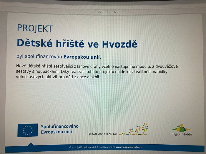 Úvod > Život v obci > Aktuality > Projekt "DĚTSKÉ HŘIŠTĚ VE HVOZDĚ" byl spolufinancován Evropskou unií.