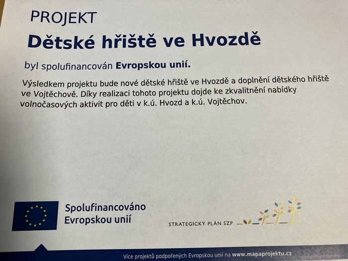 Naše obec obdržela dotaci z Evropské unie na projekt "Dětské hřiště ve Hvozdě", který byl realizován ve Hvozdě pod křižovatkou k Milkovu a ve Vojtěchově na hřišti. Ve Hvozdě se jedná o dvouvěžovou sestavu s houpačkovým modulem a lanovkou a ve Vojtěchově je na hřišti umístěna lanovka.